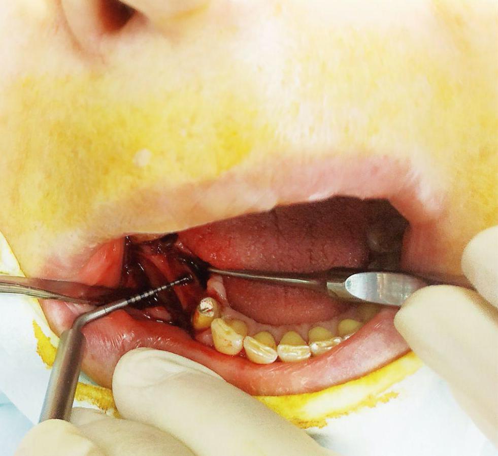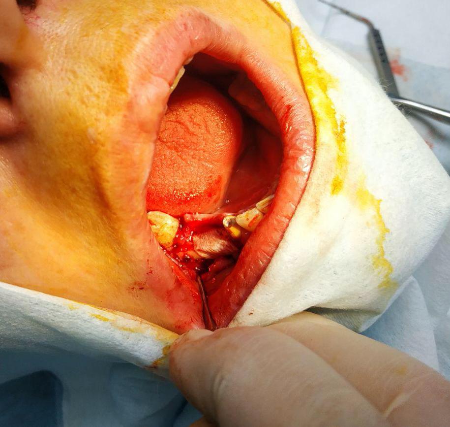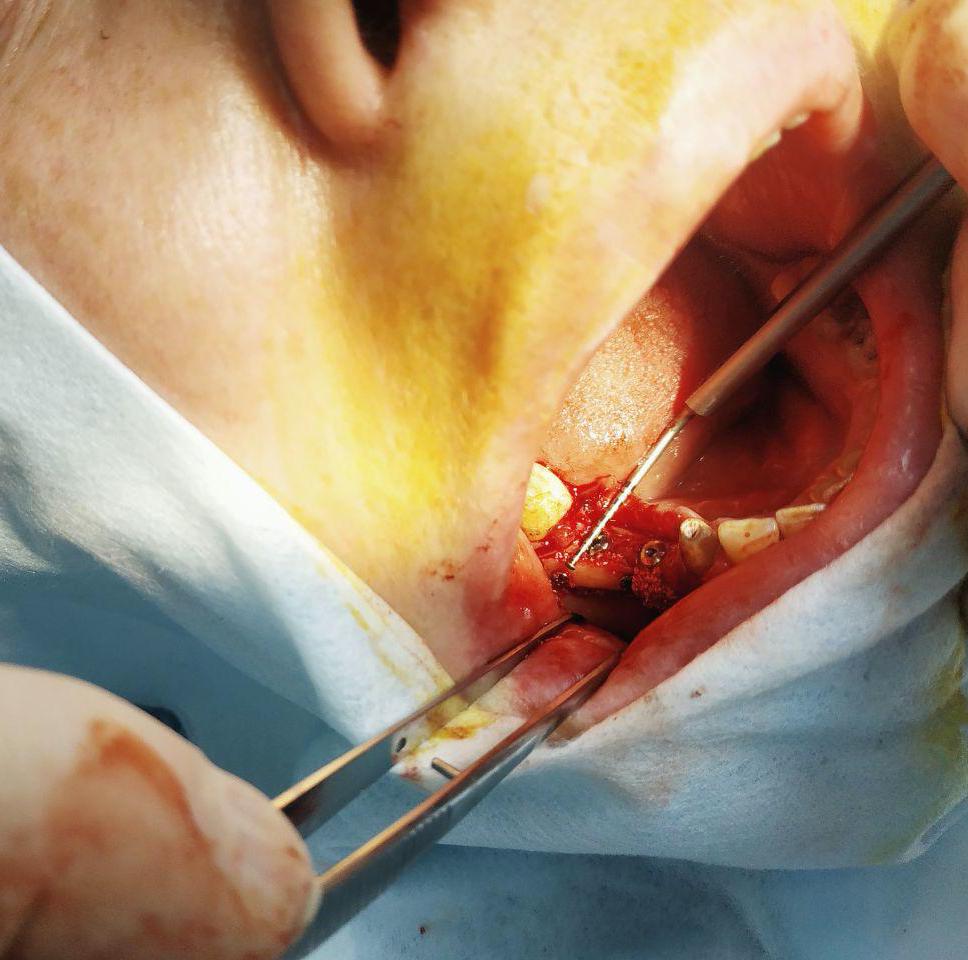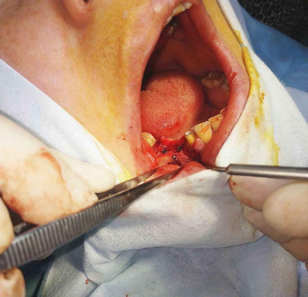Лечение: Принято решение о пересадки ее собственной кости из угла челюсти. Отслоение слизисто-надкостничного лоскута. Забор блока кости в области угла челюсти. Остеопластика блоками + ксенографт. Установка двух имплантов. Наложение швов.