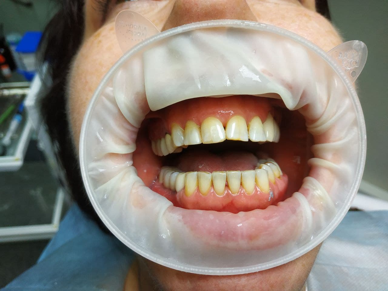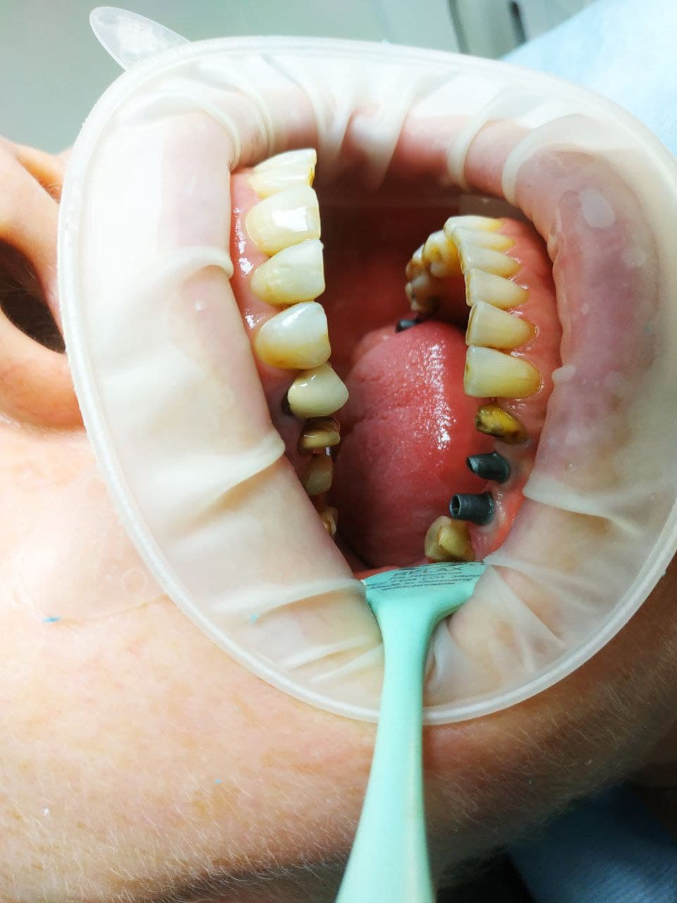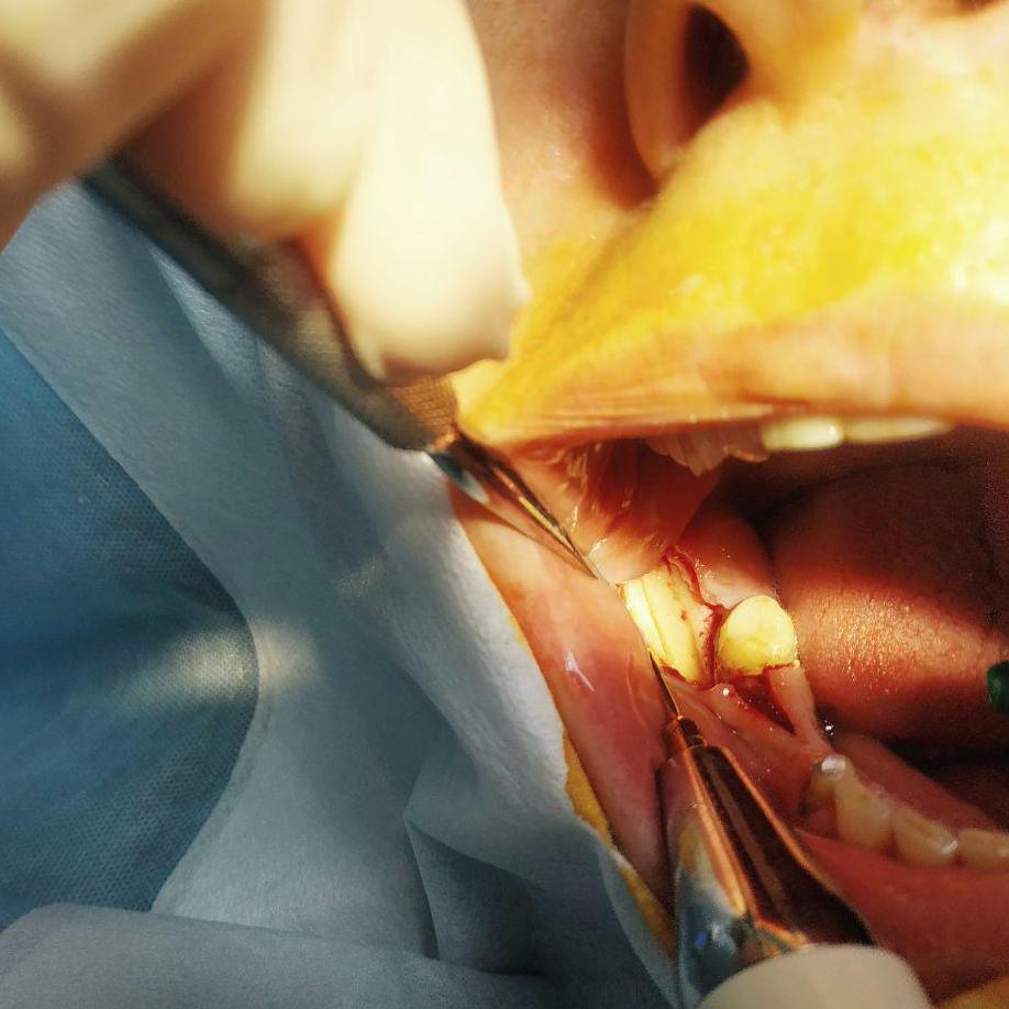 Лечение: Принято решение о пересадки ее собственной кости из угла челюсти. Отслоение слизисто-надкостничного лоскута. Забор блока кости в области угла челюсти. Остеопластика блоками + ксенографт. Установка двух имплантов. Наложение швов.